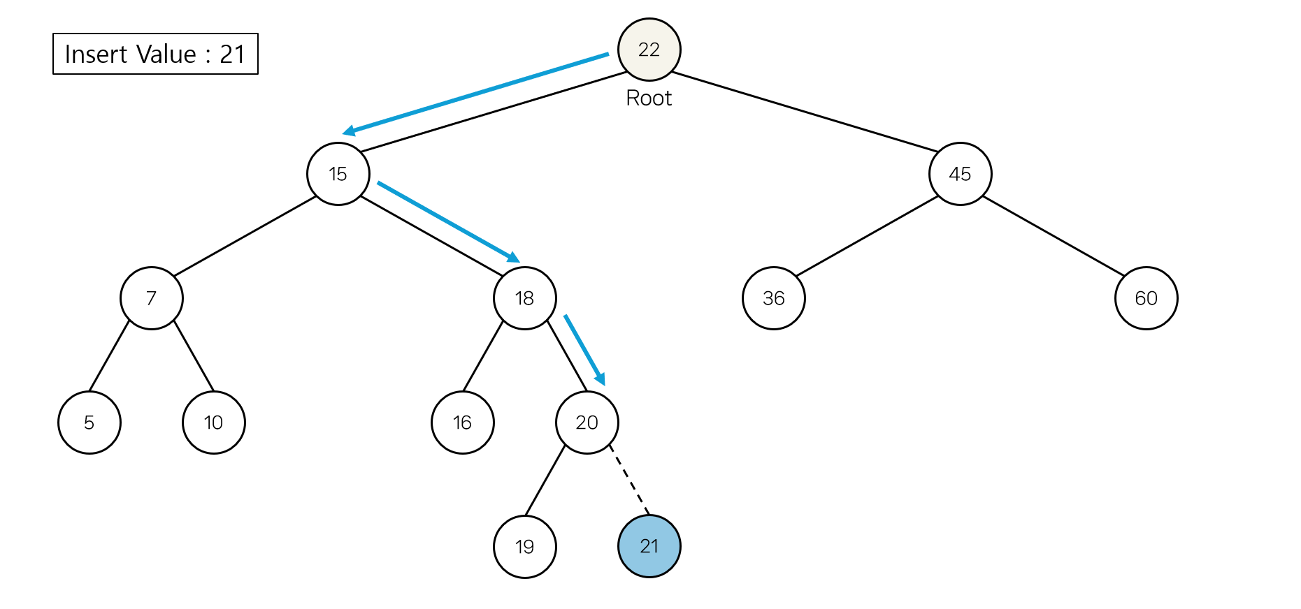 - 삽입할 값이 현재 노드의 값보다 크다면 오른쪽 자식 노드로 이동한다.