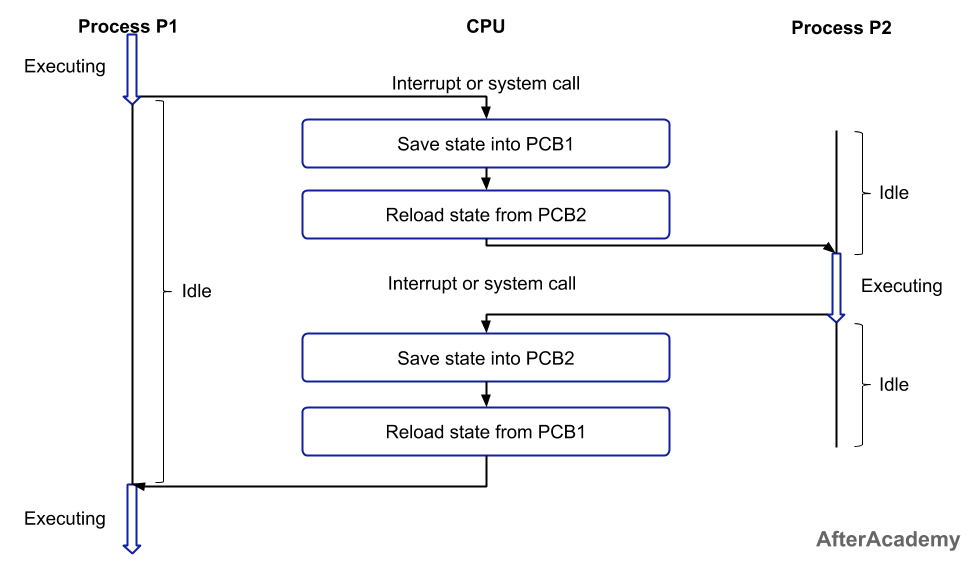 5) (반복) 인터럽트 발생 시, Process P2의 상태를 PCB2에서 로드한다.